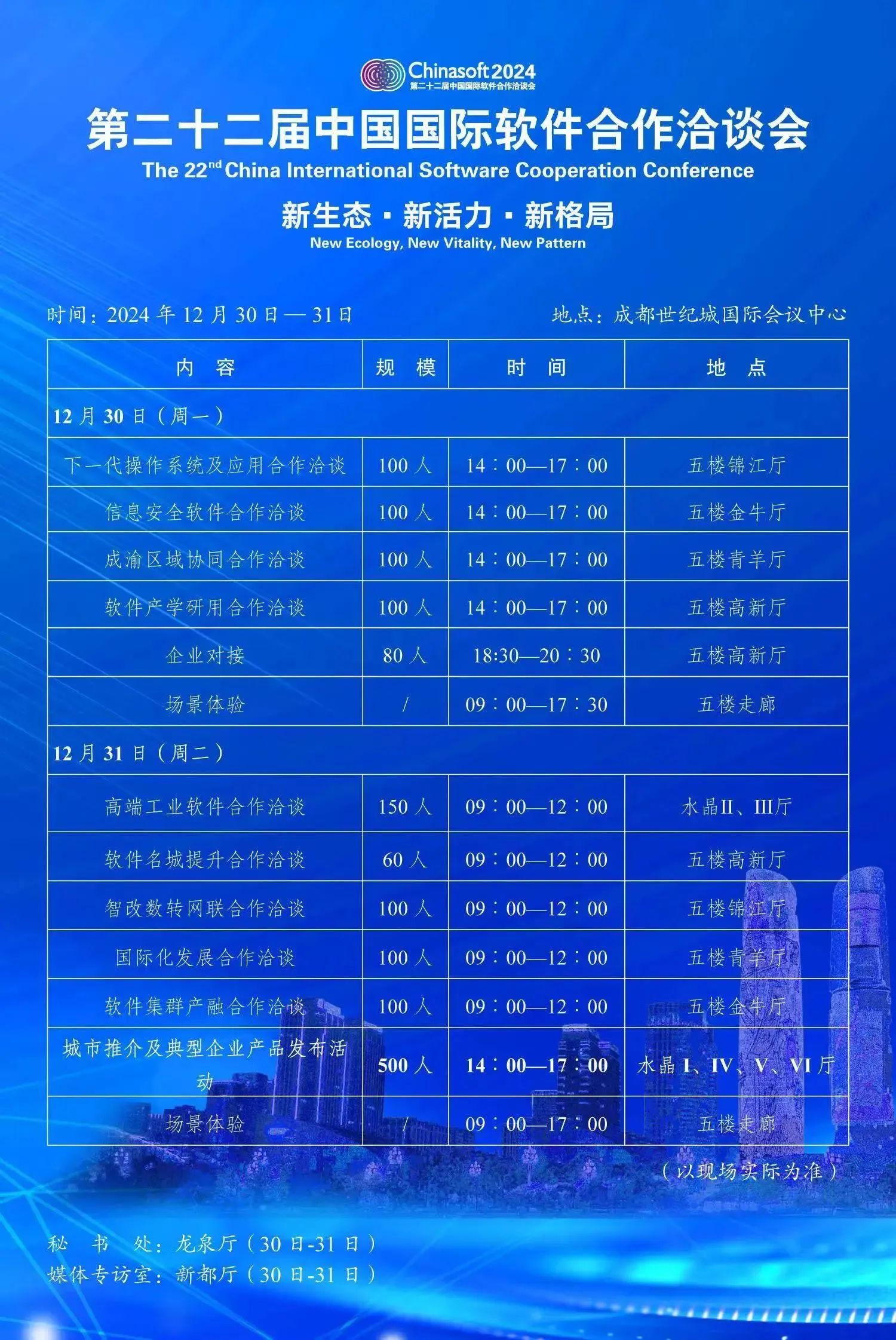 中国国际软件合作洽谈会自2003年创办以来,已经连续举办21届,是副省级城市中坚持举办最久的全国性软件产业品牌大会。据悉,第二十二届中国国际软件合作洽谈会将于2024年12月30日至31日在成都世纪城国际会议中心举行。本届大会将以“新生态·新活力·新格局”为主题,围绕制造强国、网络强国、数字中国战略部署以及省市软件